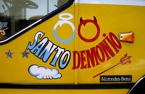 Pero no hay por qué desesperarse, por dos razones. Primero, consideremos sin prejuicios el ámbito de una micro, allí donde el «piloto» es rey y el copiloto es tatita Dios: espejos que murmuran «Fea», cortinitas, flecos, sórdidos zapatos de guagua, CD’s colgando, virgencitas de plástico mancilladas de esmog que se iluminan por dentro al ritmo de vallenatos, peseras con tachuelas de bronce, palanca de cambios con manija de flores en ámbar de polímero, pegatinas de aceite de motor, radio a todo chancho y pantalones arremangados que dejan a la vista calcetines sujetos con elástico cuando la pantorrilla hace chirriar la caja de cambios desguañangada. Con su exceso híbrido y sudaquiento, ese micro-territorio es uno de los espacios donde Chile se comunica con el resto de América Latina. El micrero chileno se sentiría como en su casa en un pesero del D.F. o en un «coletivo» de Buenos Aires, porque hay una hermandad estética en las micros del hemisferio. Por ese lado hemos alcanzado el sueño de Bolívar-no hay nada más latinoamericano que dar vueltas en las selvas urbanas, volándose de humo diésel y dejando que la fatiga derive en un vaivén de cabezazos contra la ventanilla.