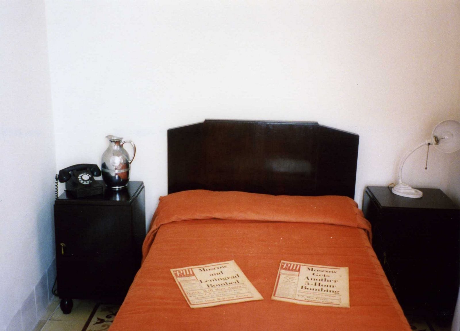 En la cama, colocados con exacta simetría, hay diarios antiguos. Los titulares que alguna vez fueron tan urgentes ahora se leen como trivia del siglo veinte: bombardeos, invasiones, hazañas de prensa amarilla. La cama está acordonada y parece demasiado frágil para haber sostenido a un peso-pesado como Papa Hemingway.