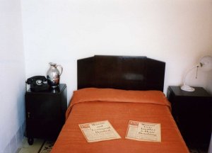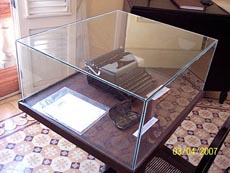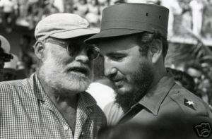 En la pieza-museo no hay casi nada de interés: una máquina de escribir antigua dentro de una caja de vidrio, una vitrina triste con libros azumagados por el trópico, un barco a escala de bonsai, algunos papeles manuscritos, un estuche con un par de lentes, un teléfono antiguo en un velador y una lámpara sin ampolleta que parece sacada de un hospital. Hay algunas fotos colgadas en las paredes blancas, entre ellas una de Hemingway con Fidel en la que no se sabe cuál de los dos está más incómodo mientras aparentan lo contrario.