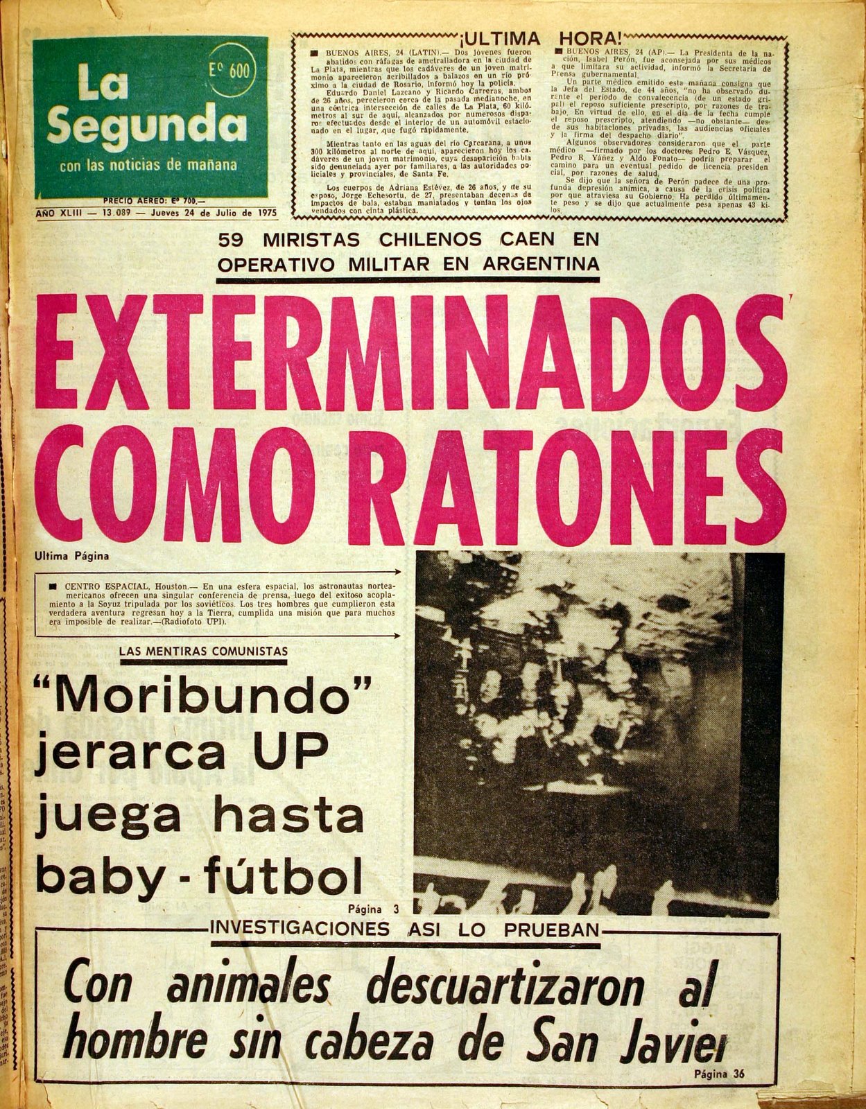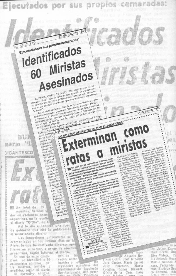 El segundo paso consistió en inventar un par de revistas y diarios falsos, publicados en Brasil, Argentina y México, donde se confirma la presencia de los extremistas chilenos en diversos lugares de América Latina y en Francia. Se identificaba entre ellos a varios de los que en Chile se denunciaban como desaparecidos. El golpe sensacionalista fue que los guerrilleros chilenos se estarían matando entre ellos, por venganzas y rivalidades políticas. El titular de portada La Segunda del 24 de julio de 1975 culmina la maniobra de manera brutal: “Exterminados como ratones”. En la misma portada se reafirma el mensaje: “ ‘Moribundo jerarca UP juega hasta baby-fútbol’”. En el interior del diario, donde se reitera la metáfora de la portada (“Exterminan como ratas a miristas”), La Segunda entrega los nombres de los muertos en enfrentamientos con la policía argentina, todos en la lista de los 119 que había presentado la dictadura como prueba de su inocencia.