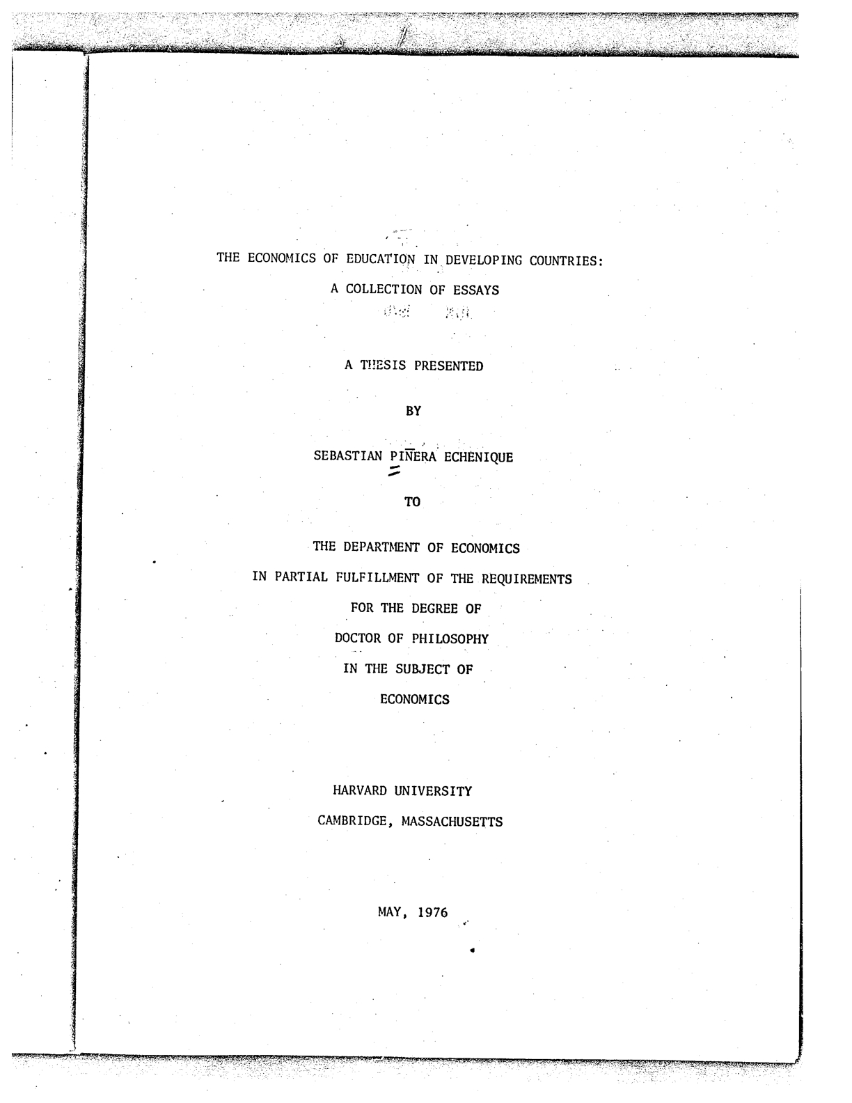 Este blog tiene en sus manos una copia oficial de la tesis de Sebastián Piñera para optar al grado de Ph.D. de la Universidad de Harvard (Mayo, 1976). No hay grandes sorpresas o revelaciones que surjan a primera vista. El título es sencillo y genérico, pero no revela mucho acerca de los contenidos: The Economics of Education in Developing Countries: A Collection of Essays (La economía de la educación en países en desarrollo: una colección de ensayos).