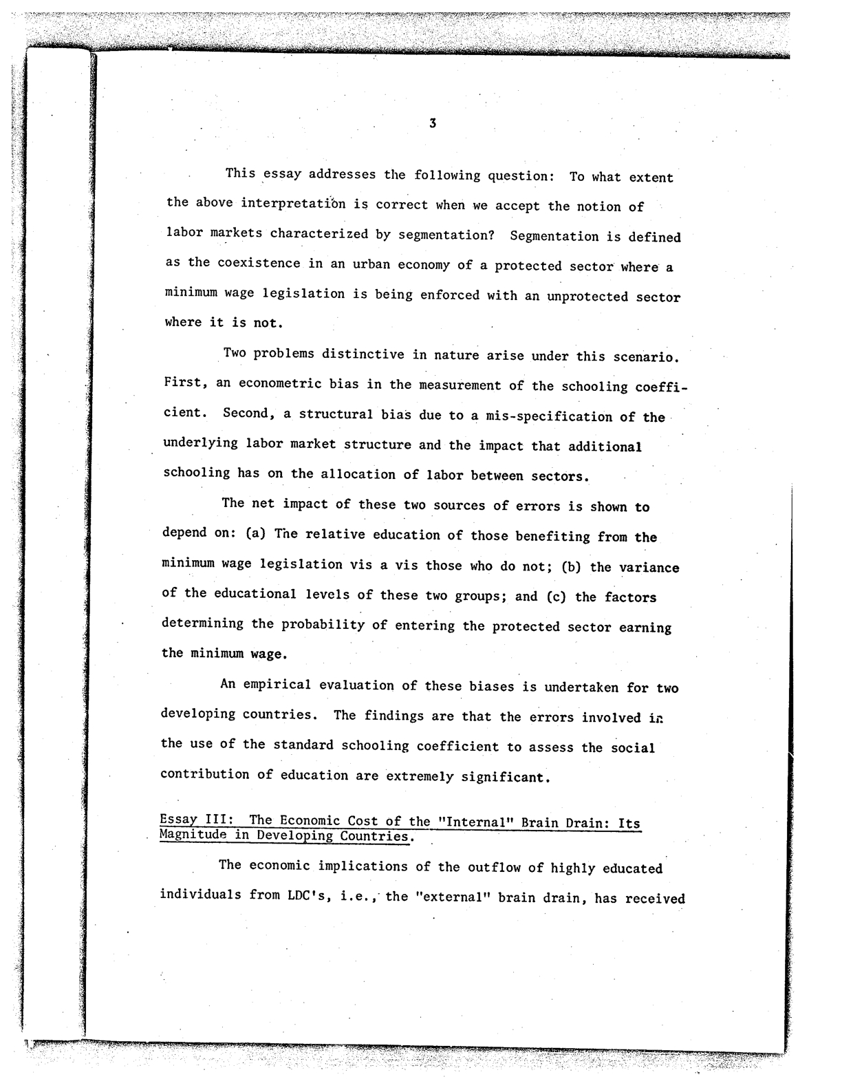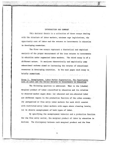 “Los primeros dos ensayos representan un análisis teórico y empírico de la medición adecuada de los retornos verdaderos de la inversión en educación en mercados laborales segmentados. El tercer ensayo es de una índole diferente. Analiza teórica y empíricamente algunas reformas educacionales diseñadas para aumentar los retornos de los recursos educacionales en países en desarrollo. […] se resumen brevemente los ensayos.”
