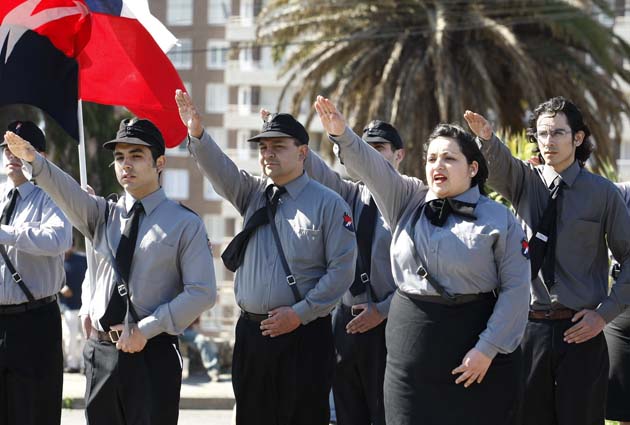 No extraña que haya nazis en nuestro país, pero sí llama la atención que haya nazis chilenos, sobre todo si uno piensa que Chile es un país mayoritariamente mestizo y por lo tanto «impuro», poblado de Untermensch, quiltros aptos para crematorios. Para esta contradicción vital, los nazis criollos tienen sus respuestas deschavetadas, las que difunden sin que nadie se atreva a trabarse en un diálogo crítico con ellos. Dejan caer nombres de filósofos alemanes o deidades germánicas como quien tira bombas de ruido, y les resulta. Una especie de biblia del nacismo criollo, por ejemplo, es el mamotreto nacionalista Raza chilena (1904) de Nicolás Palacios, donde se aduce que algunos de los «araucanos» son más bien arios, que ésos son los verdaderos antepasados nuestros (junto a los españoles «góticos») y que por ese lado nos podríamos merecer un lugar en Valhalla. Si Nicolás Palacios, a pesar de que sus teorías no tienen ni pie ni cabeza, sigue siendo considerado un clásico de la identidad chilena (Carlos Cardoen financió su re-edición de lujo hace algunos años), entonces los nazis sienten que tienen el camino despejado para propagar sus propias doctrinas en Chile y fundar escuelas sin temor al ridículo.